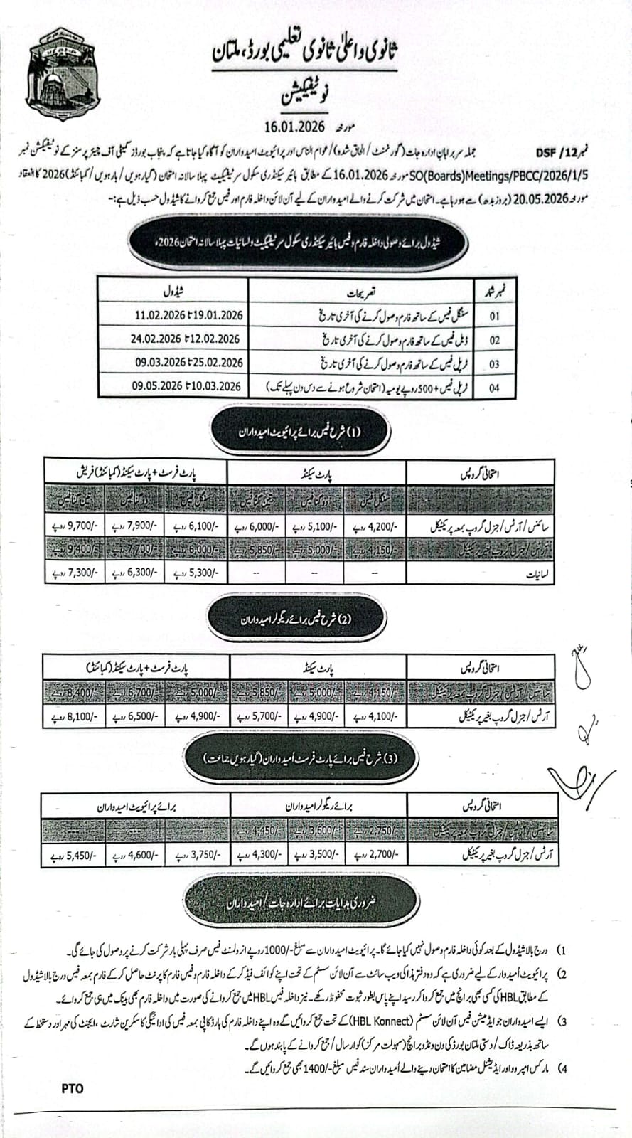 The admission process for matric and inter exams start few months before the start of the exams. Soon after the start of admission process, the admission forms are available to the students and they can submit the admission forms within due date. Initially, the students have to deposit admission fee. Then the completely filled form will be submitted along with necessary documents and bank challan form. The students who could not submit their forms with single fee can submit their forms with late fee and double fee also. Multan Board stops receiving the forms about one month before the start of the exams.